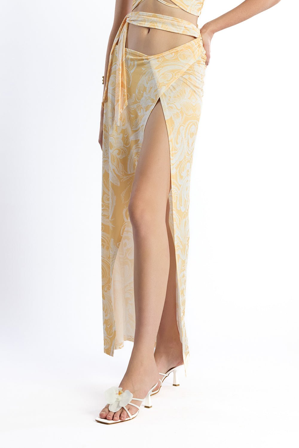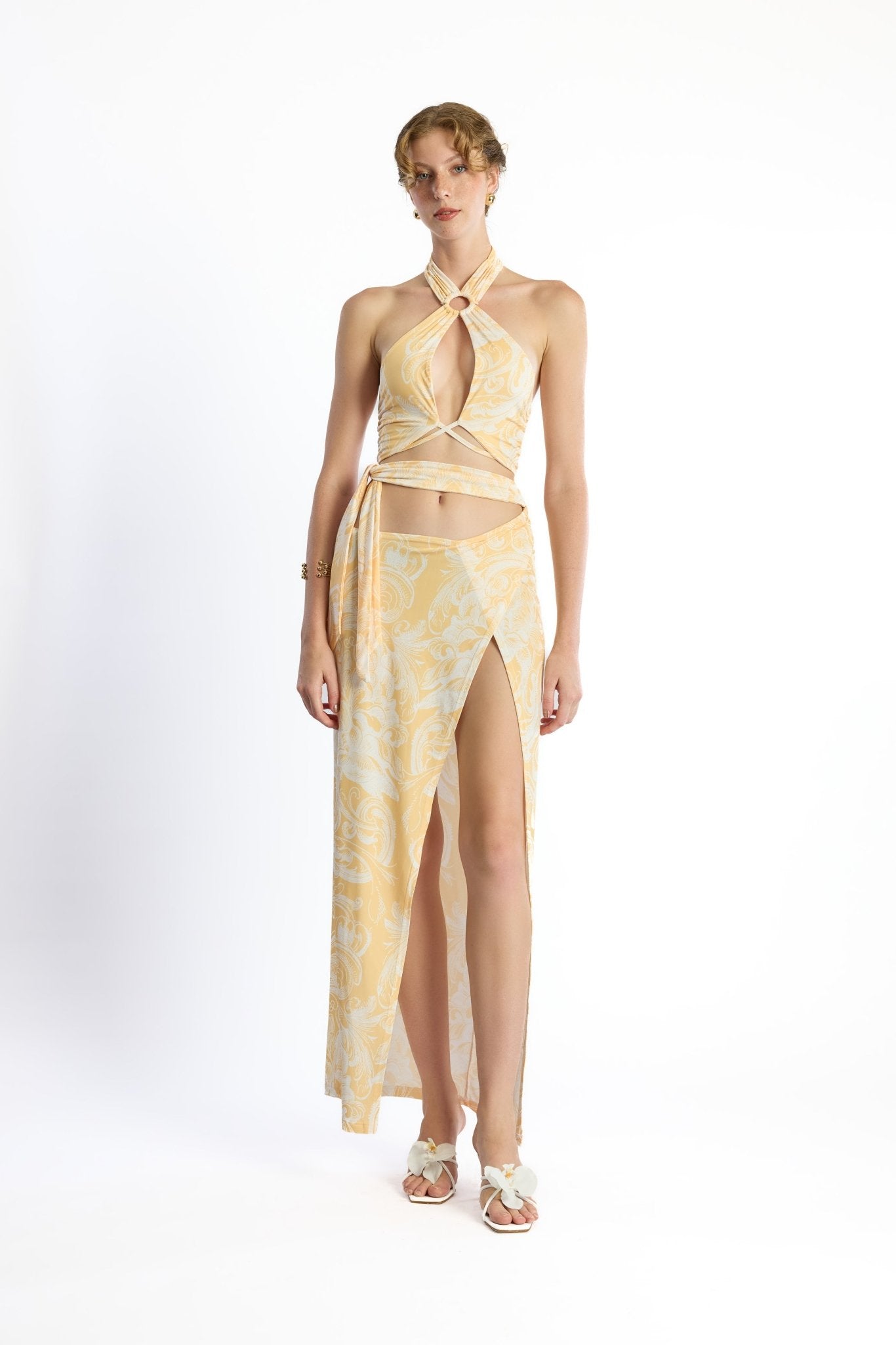 Glide etek, vücuda oturan formu ve yüksek yırtmacıyla zarif ama cesur bir görünüm sunar. Bel kısmındaki bağlama detayı sayesinde vücuda tam oturur. Tatillerin ve yaz gecelerinin vazgeçilmezi.