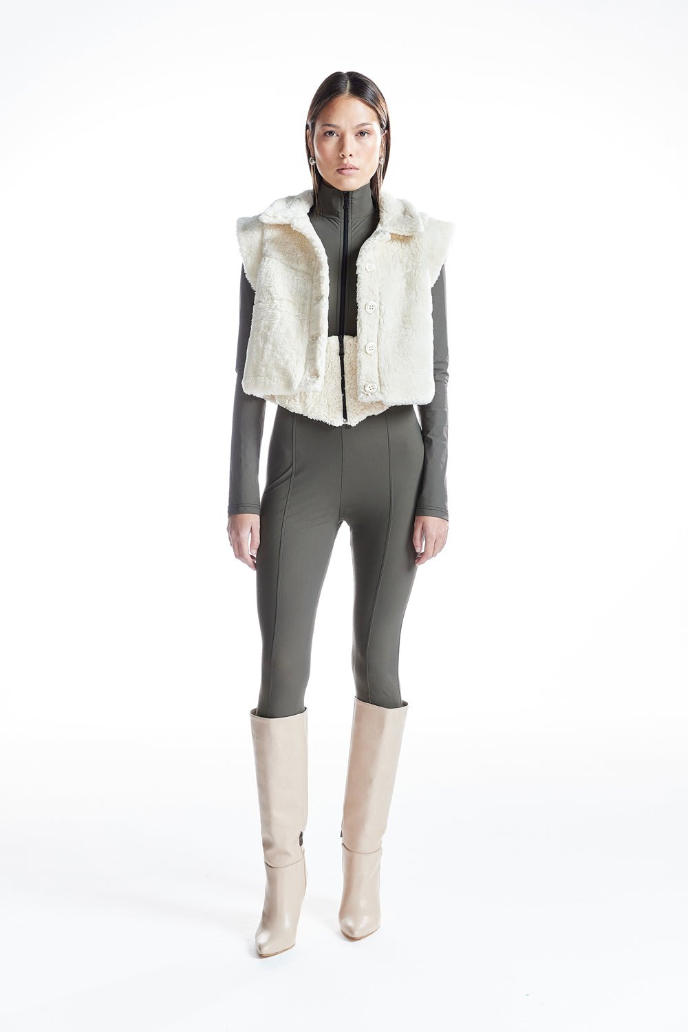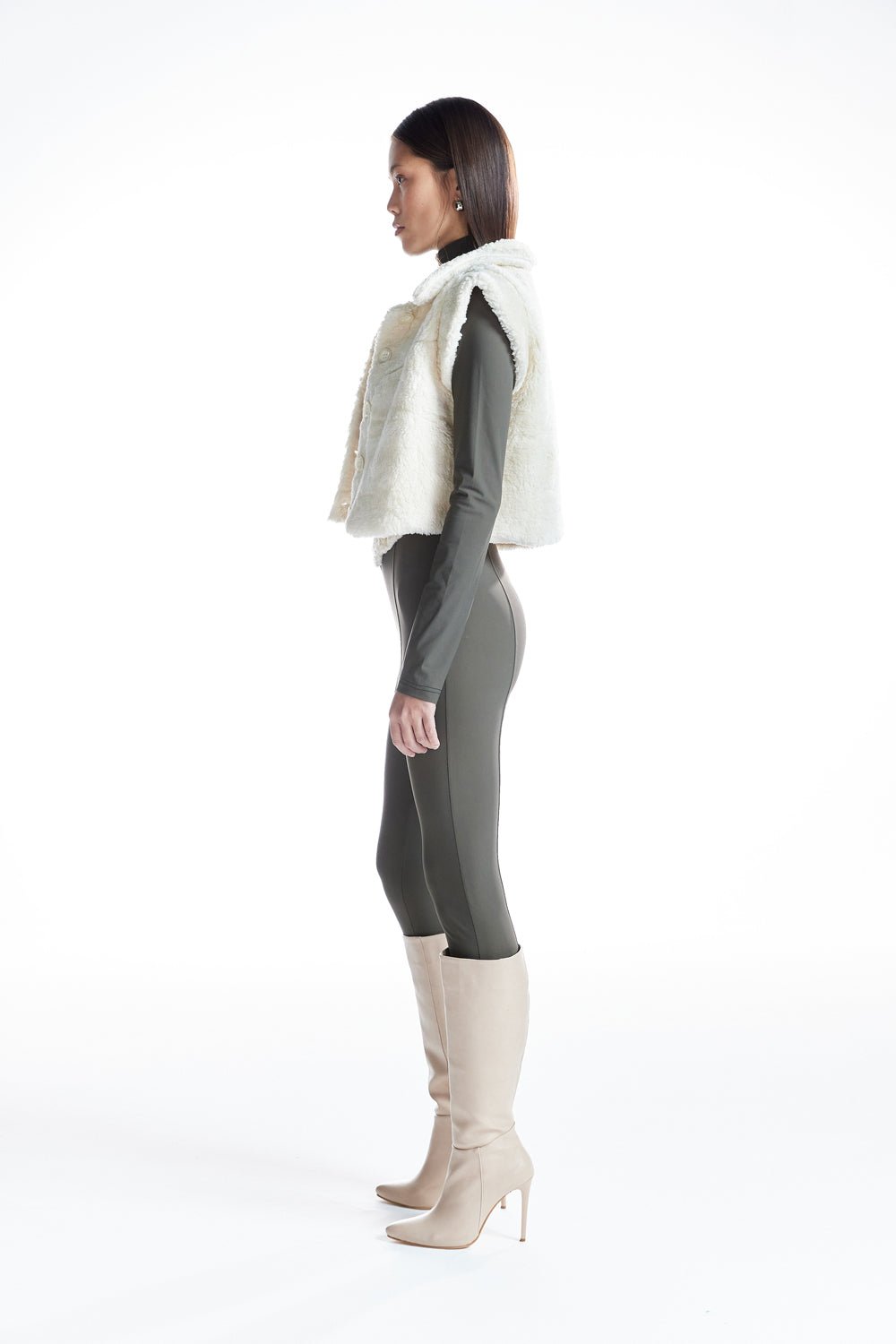 Minimalist tasarımı ve teddy kumaş dokusuyla hem sıcak hem de stil sahibi bir görünüm sunan oversize crop yelek, düğme detayıyla klasik bir dokunuş katıyor. Katmanlı kombinler için ideal bir tamamlayıcıdır.